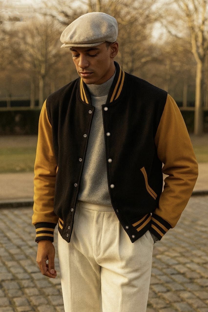 A baseball jacket, also known as a varsity jacket or letterman jacket, is a timeless outerwear piece that blends sporty style with casual comfort. Originally worn by high school and college athletes in the U.S., it features a classic design with a snap-front closure, ribbed collar, cuffs, and hem, and a mix of materials—typically a wool body with leather or faux leather sleeves.